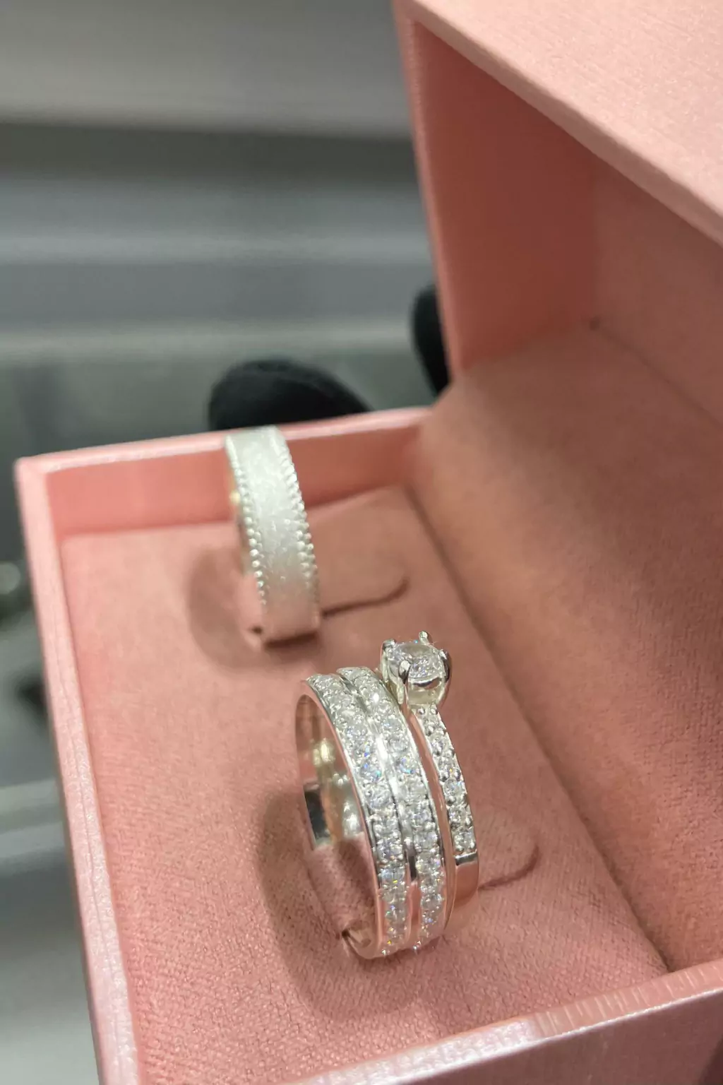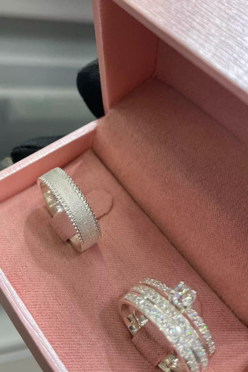 E não poderia faltar, o anel solitário, que também tem uma trabalho de cravejação acompanhando a beleza desse par de alianças que é feito todo em prata 950 com garantia eterna. (Anel solitario não incluso, escolha se deseja ou não com o anel solitário)