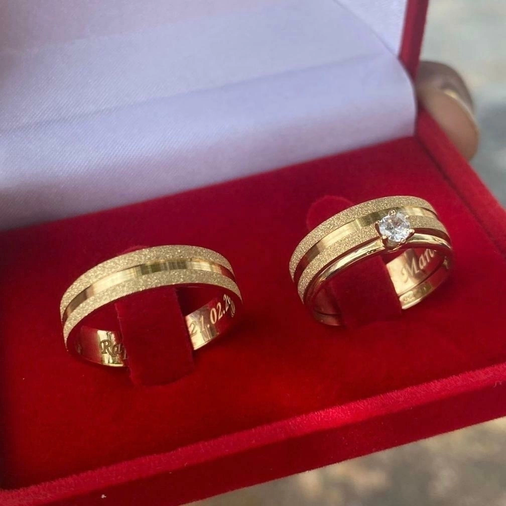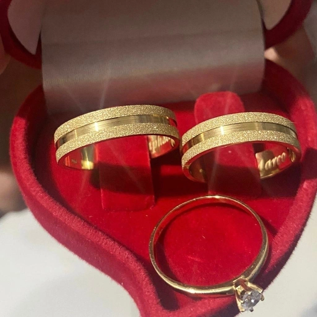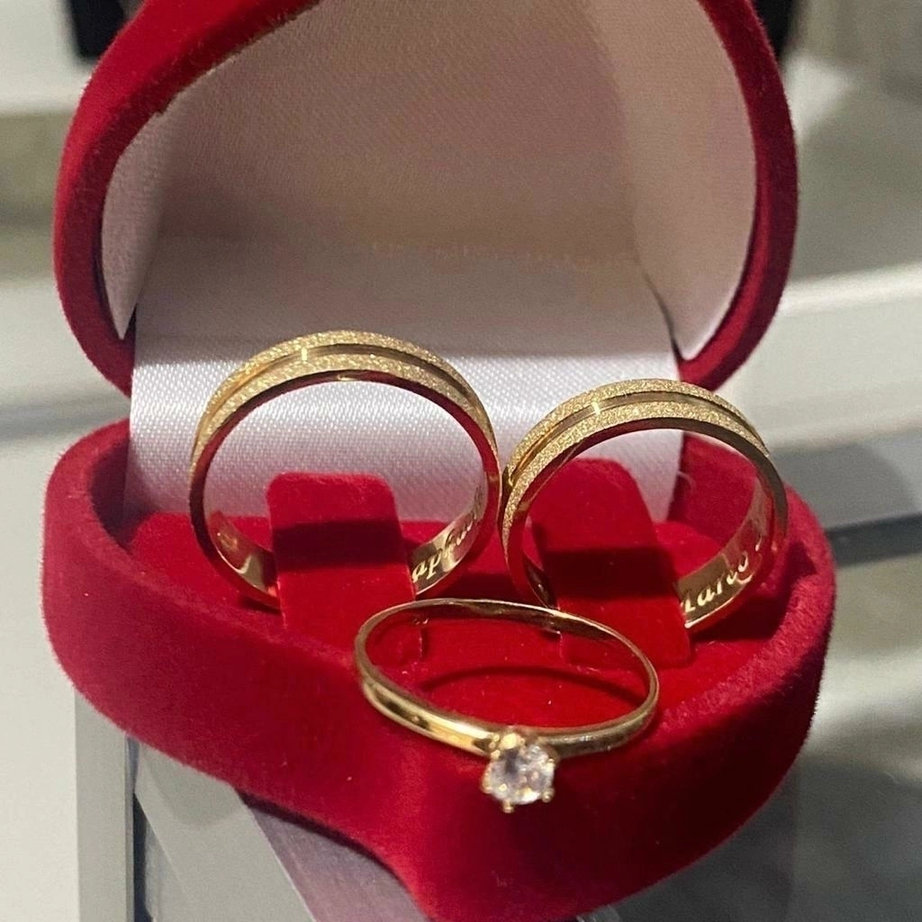 Peso aproximado: Par de alianças 9 gramas, solitário 1,8 gramas.